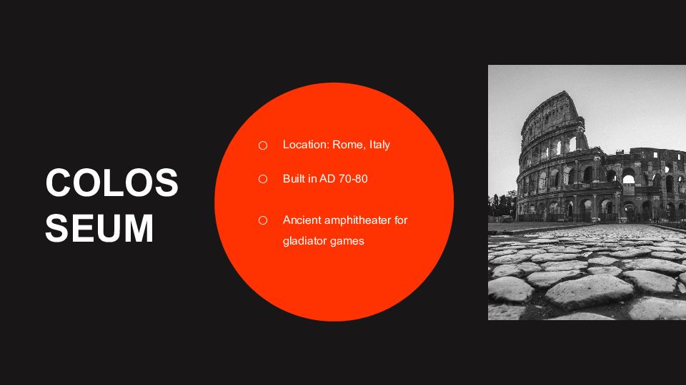 Location: Rome, Italy Built in AD 70-80 Ancient amphitheater for gladiator games
