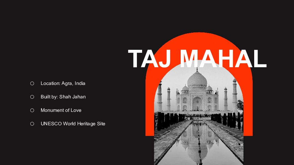 Location: Agra, India Built by: Shah Jahan Monument of Love UNESCO World Heritage Site