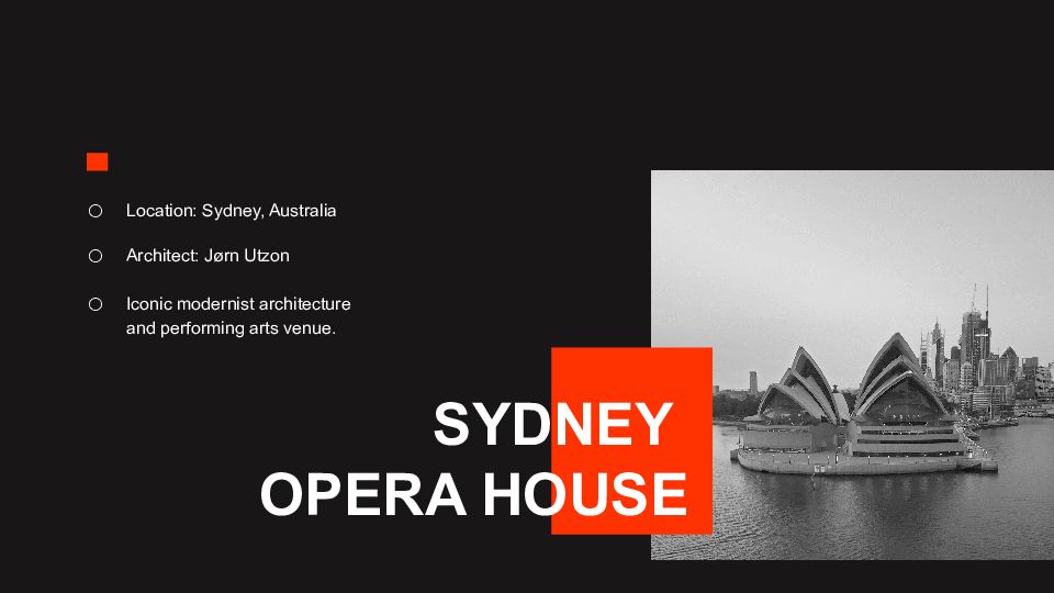 Location: Sydney, Australia Architect: Jørn Utzon Iconic modernist architecture and performing arts venue.
