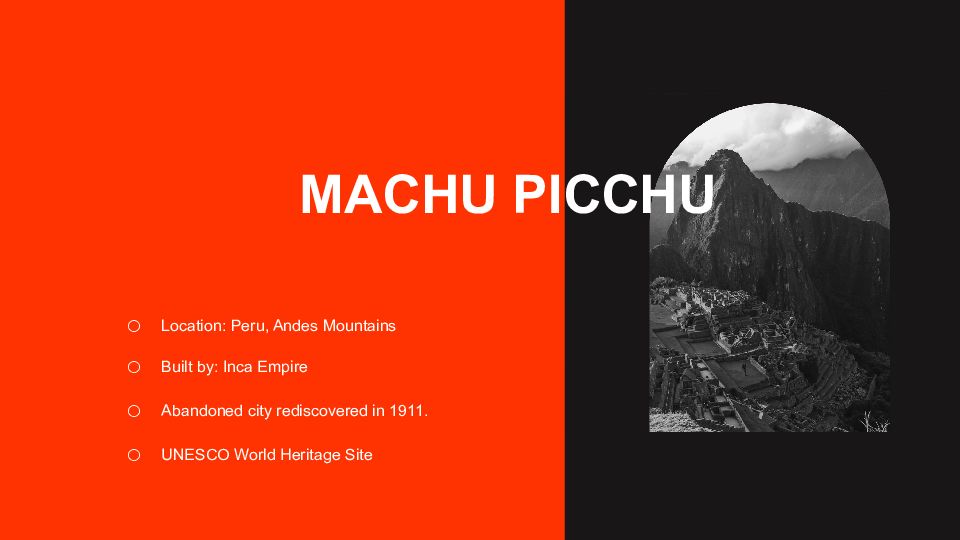 Location: Peru, Andes Mountains Built by: Inca Empire Abandoned city rediscovered in 1911. UNESCO World Heritage Site MACHU PICCHU