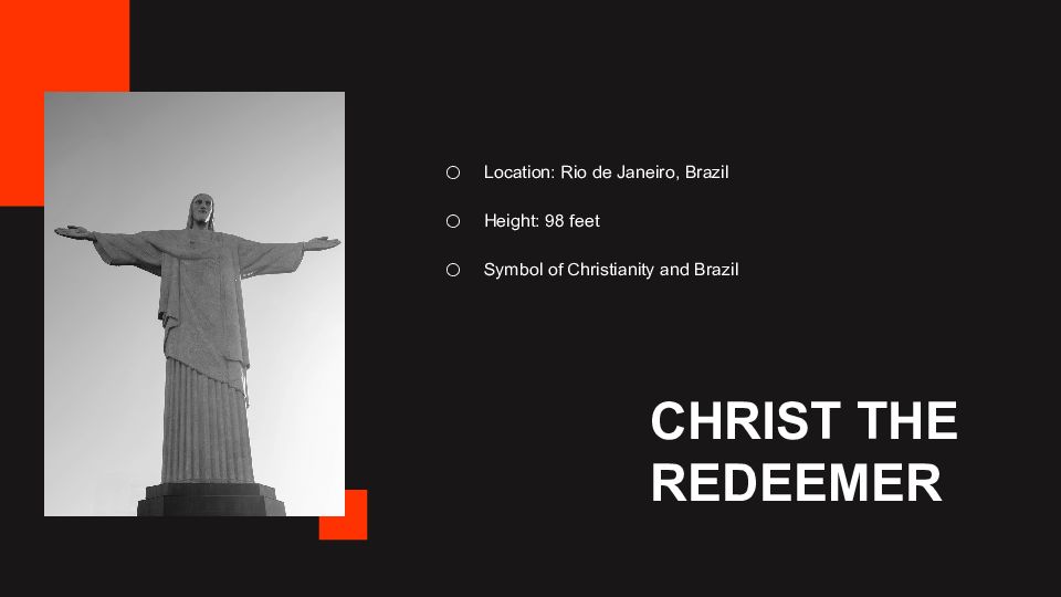 Location: Rio de Janeiro, Brazil Height: 98 feet Symbol of Christianity and Brazil CHRIST THE REDEEMER