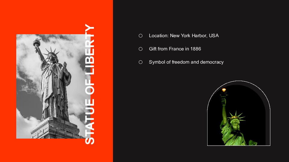 STATUE OF LIBERTY Location: New York Harbor, USA Gift from France in 1886 Symbol of freedom and democracy