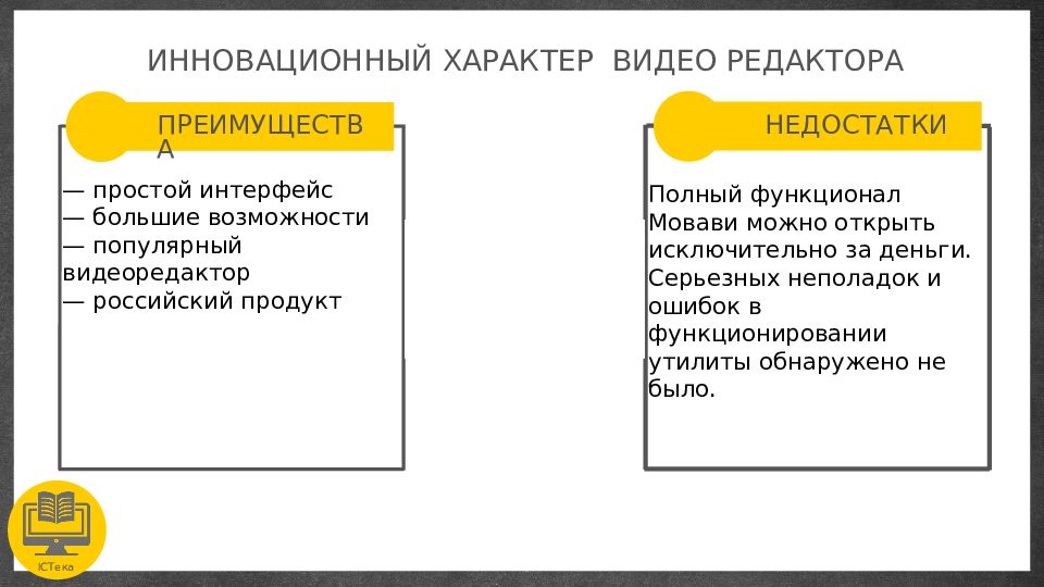 ПРЕИМУЩЕСТВА ICTека ИННОВАЦИОННЫЙ ХАРАКТЕ Р ВИДЕО РЕДАКТОРА НЕДОСТАТКИ — простой интерфейс — большие возможности — популярный видеоредактор — российский продукт Полный функционал Мовави можно открыть исключительно за деньги. Серьезных неполадок и ошибок в функционировании утилиты обнаружено не было.