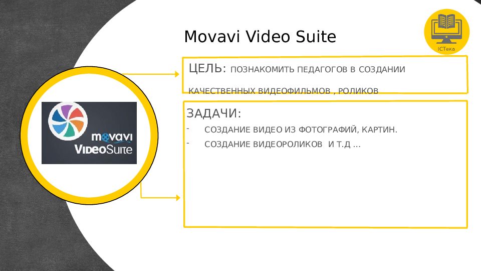 ICTека Movavi Video Suite ЦЕЛЬ: ПОЗНАКОМИТЬ ПЕДАГОГОВ В СОЗДАНИИ КАЧЕСТВЕННЫХ ВИДЕОФИЛЬМОВ, РОЛИКОВ ЗАДАЧИ: СОЗДАНИЕ ВИДЕО ИЗ ФОТОГРАФИЙ, КАРТИН. СОЗДАНИЕ ВИДЕОРОЛИКОВ И Т.Д …