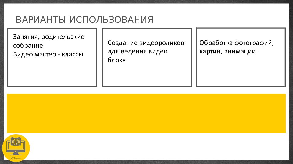 ICTека ВАРИАНТЫ ИСПОЛЬЗОВАНИЯ Занятия, родительские собрание Видео мастер - классы Создание видеороликов для ведения видео блока Обработка фотографий, картин, анимации.