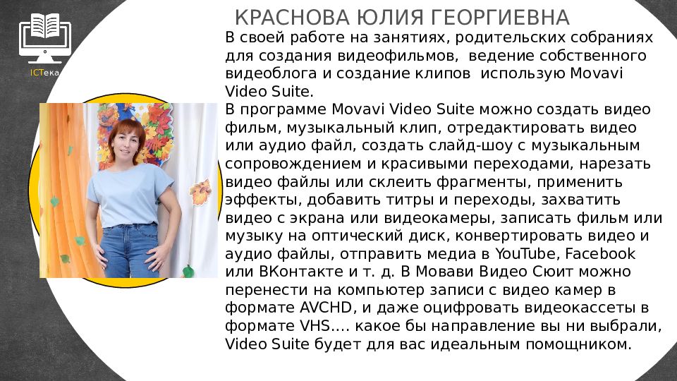 ICT ека КРАСНОВА ЮЛИЯ ГЕОРГИЕВНА В своей работе на занятиях, родительских собраниях для создания видеофильмов, ведение собственного видеоблога и создание клипов использую Movavi Video Suite. В программе Movavi Video Suite можно создать видео фильм, музыкальный клип, отредактировать видео или аудио файл, создать слайд-шоу с музыкальным сопровождением и красивыми переходами, нарезать видео файлы или склеить фрагменты, применить эффекты, добавить титры и переходы, захватить видео с экрана или видеокамеры, записать фильм или музыку на оптический диск, конвертировать видео и аудио файлы, отправить медиа в YouTube, Facebook или ВКонтакте и т. д. В Мовави Видео Сюит можно перенести на компьютер записи с видео камер в формате AVCHD, и даже оцифровать видеокассеты в формате VHS. … какое бы направление вы ни выбрали, Video Suite будет для вас идеальным помощником.