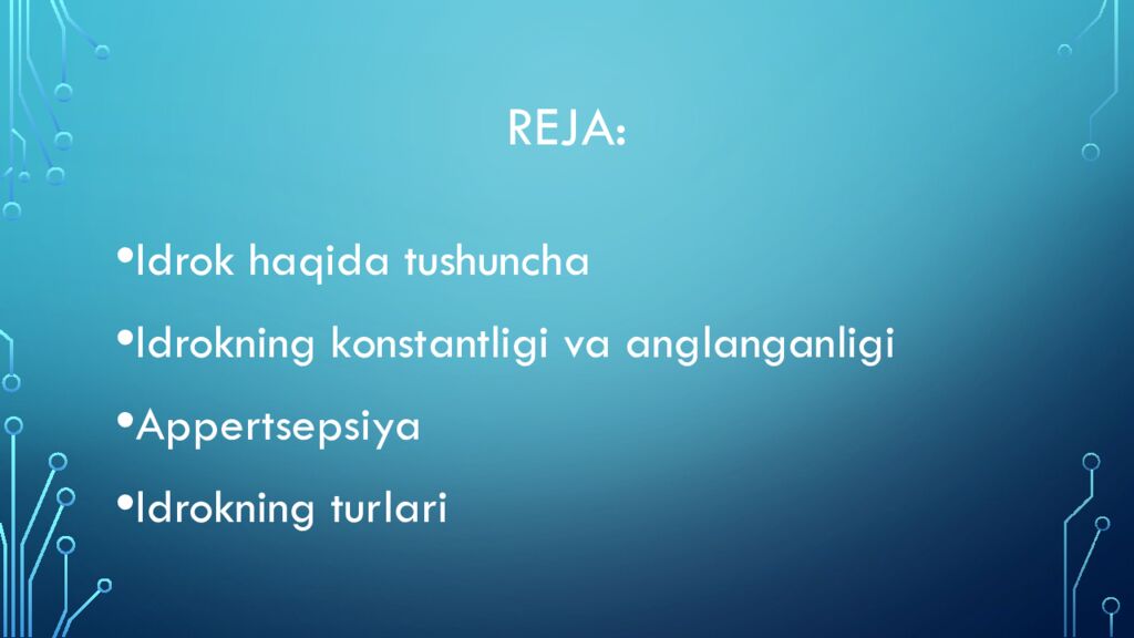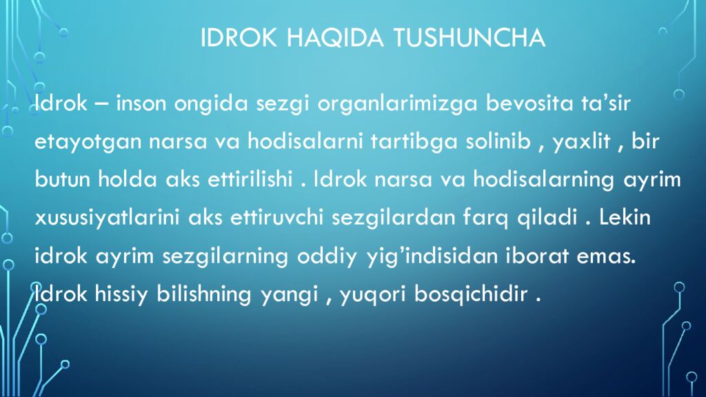 Idrok haqida tushuncha Idrokning konstantligi va anglanganligi Appertsepsiya Idrokning turlari