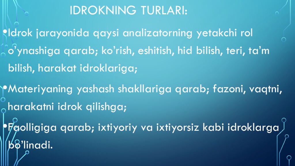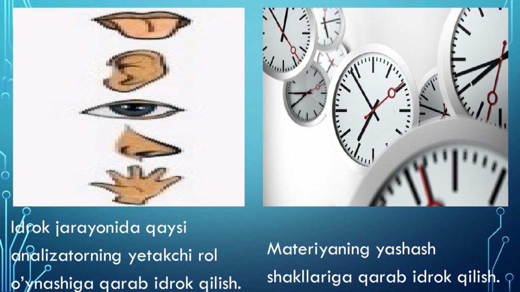 Idrok jarayonida qaysi analizatorning yetakchi rol o’ynashiga qarab idrok qilish. Materiyaning yashash shakllariga qarab idrok qilish.