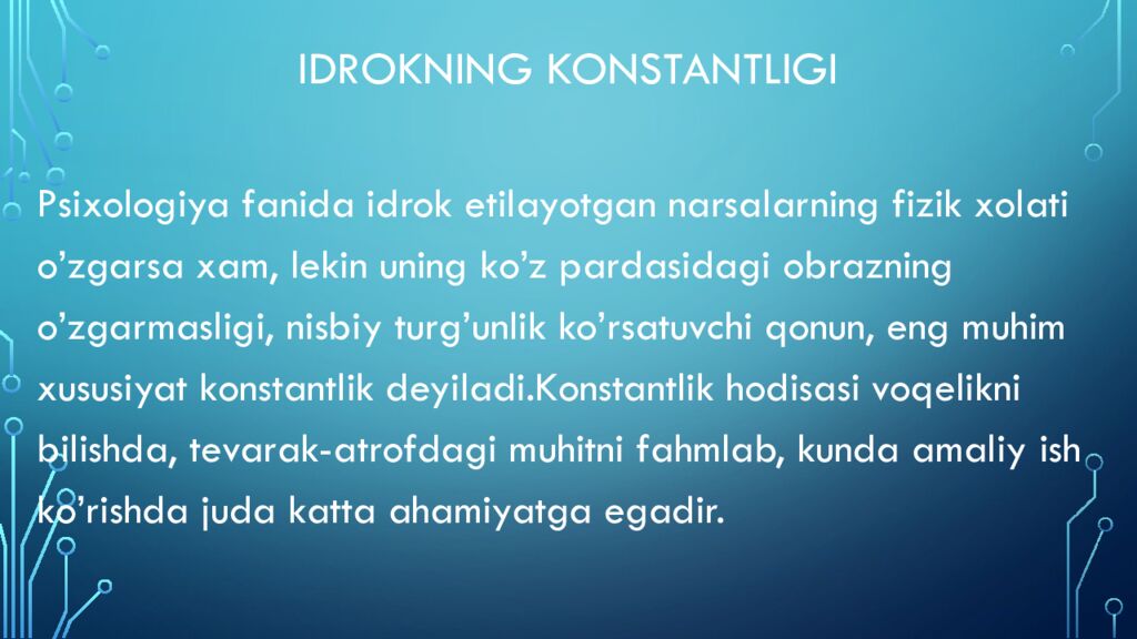 Psixologiya fanida idrok etilayotgan narsalarning fizik xolati o’zgarsa xam, lekin uning ko’z pardasidagi obrazning o’zgarmasligi, nisbiy turg’unlik ko’rsatuvchi qonun, eng muhim xususiyat konstantlik deyiladi.Konstantlik hodisasi voqelikni bilishda, tevarak-atrofdagi muhitni fahmlab, kunda amaliy ish ko’rishda juda katta ahamiyatga egadir.