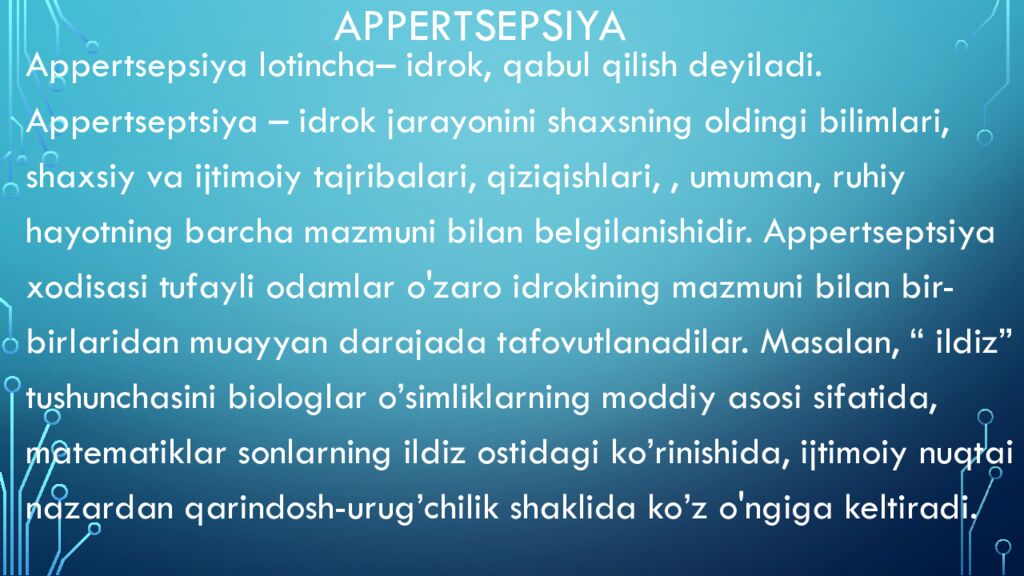 Appertsepsiya lotincha– idrok, qabul qilish deyiladi. Appertseptsiya – idrok jarayonini shaxsning oldingi bilimlari, shaxsiy va ijtimoiy tajribalari, qiziqishlari,, umuman, ruhiy hayotning barcha mazmuni bilan belgilanishidir. Appertseptsiya xodisasi tufayli odamlar o'zaro idrokining mazmuni bilan bir-birlaridan muayyan darajada tafovutlanadilar. Masalan, “ ildiz” tushunchasini biologlar o’simliklarning moddiy asosi sifatida, matematiklar sonlarning ildiz ostidagi ko’rinishida, ijtimoiy nuqtai nazardan qarindosh-urug’chilik shaklida ko’z o'ngiga keltiradi.