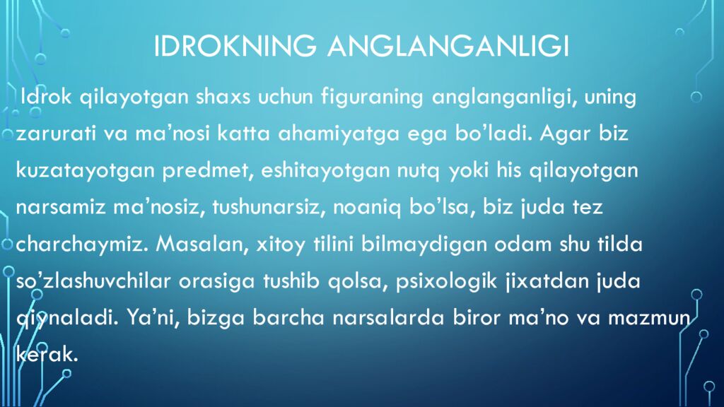 Idrok qilayotgan shaxs uchun figuraning anglanganligi, uning zarurati va ma’nosi katta ahamiyatga ega bo’ladi. Agar biz kuzatayotgan predmet, eshitayotgan nutq yoki his qilayotgan narsamiz ma’nosiz, tushunarsiz, noaniq bo’lsa, biz juda tez charchaymiz. Masalan, xitoy tilini bilmaydigan odam shu tilda so’zlashuvchilar orasiga tushib qolsa, psixologik jixatdan juda qiynaladi. Ya’ni, bizga barcha narsalarda biror ma’no va mazmun kerak.