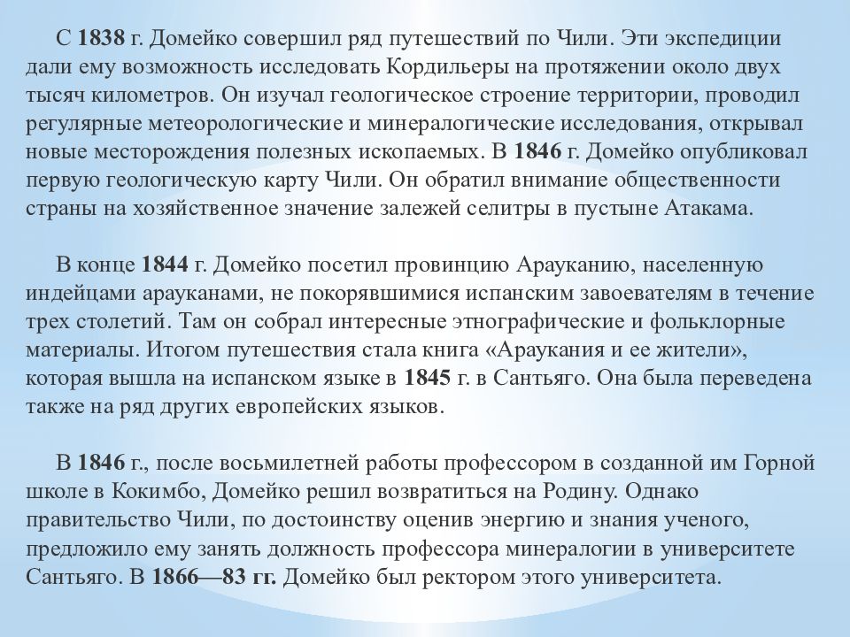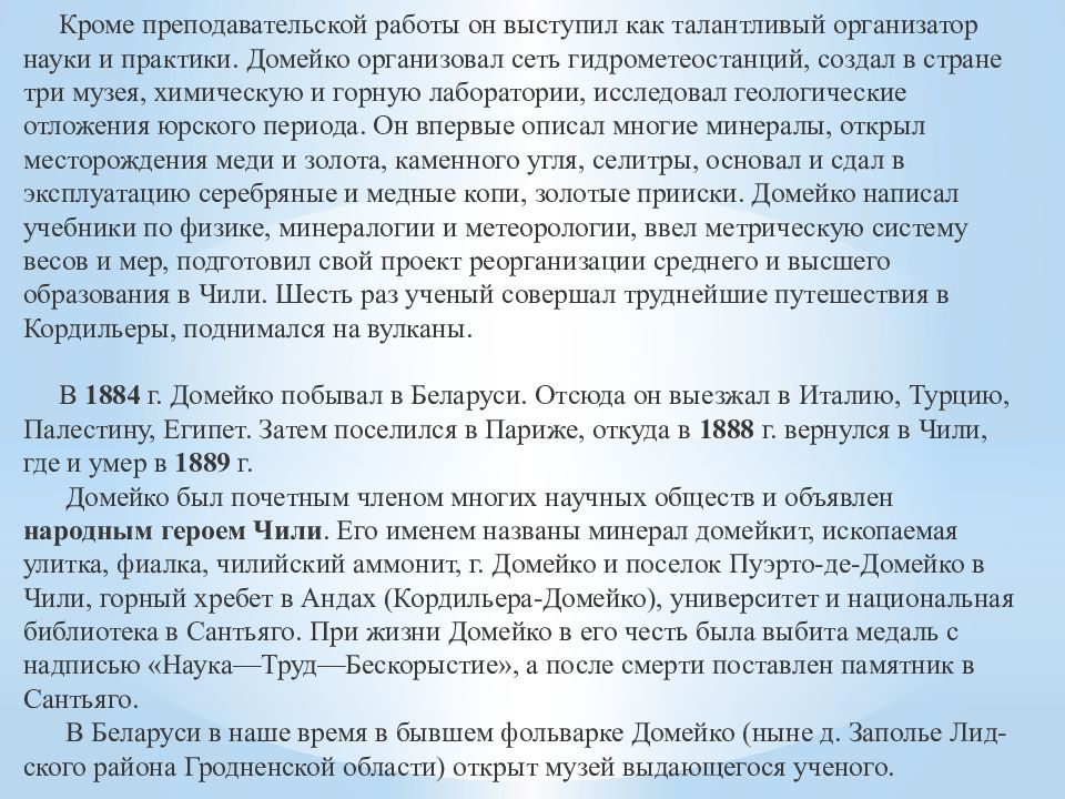 Кроме преподавательской работы он выступил как талантливый организатор науки и практики. Домейко организовал сеть гидрометеостанций, создал в стране три музея, химическую и горную лаборатории, исследовал геологические отложения юрского периода. Он впервые описал многие минералы, открыл месторождения меди и золота, каменного угля, селитры, основал и сдал в эксплуатацию серебряные и медные копи, золотые прииски. Домейко написал учебники по физике, минералогии и метеорологии, ввел метрическую систему весов и мер, подготовил свой проект реорганизации среднего и высшего образования в Чили. Шесть раз ученый совершал труднейшие путешествия в Кордильеры, поднимался на вулканы. В 1884 г. Домейко побывал в Беларуси. Отсюда он выезжал в Италию, Турцию, Палестину, Египет. Затем поселился в Париже, откуда в 1888 г. вернулся в Чили, где и умер в 1889 г. Домейко был почетным членом многих научных обществ и объявлен народным героем Чили. Его именем названы минерал домейкит, ископаемая улитка, фиалка, чилийский аммонит, г. Домейко и поселок Пуэрто-де-Домейко в Чили, горный хребет в Андах ( Кордильера -Домейко), университет и национальная библиотека в Сантьяго. При жизни Домейко в его честь была выбита медаль с надписью «Наука—Труд—Бескорыстие», а после смерти поставлен памятник в Сантьяго. В Беларуси в наше время в бывшем фольварке Домейко (ныне д. Заполье Лид- ского района Гродненской области) открыт музей выдающегося ученого.