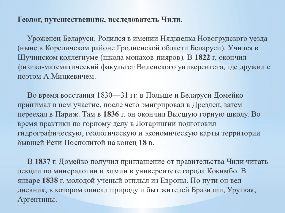 Геолог, путешественник, исследователь Чили. Уроженец Беларуси. Родился в имении Нядзведка Новогрудского уезда (ныне в Кореличском районе Гродненской области Беларуси). Учился в Щучинском коллегиуме (школа монахов- пияров ). В 1822 г. окончил физико-математический факультет Виленского университета, где дружил с поэтом А.Мицкевичем. Во время восстания 1830—31 гг. в Польше и Беларуси Домейко принимал в нем участие, после чего эмигрировал в Дрезден, затем переехал в Париж. Там в 1836 г. он окончил Высшую горную школу. Во время практики по горному делу в Лотарингии подготовил гидрографическую, геологическую и экономическую карты территории бывшей Речи Посполитой на конец 18 в. В 1837 г. Домейко получил приглашение от правительства Чили читать лекции по минералогии и химии в университете города Кокимбо. В январе 1838 г. молодой ученый отплыл из Европы. По пути он вел дневник, в котором описал природу и быт жителей Бразилии, Уругвая, Аргентины.