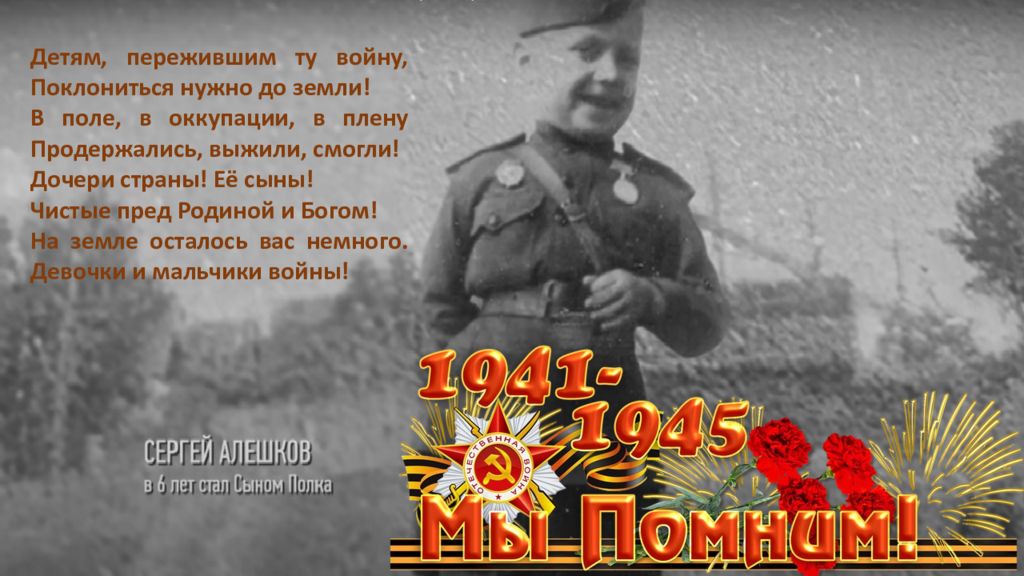 Детям, пережившим ту войну, Поклониться нужно до земли! В поле, в оккупации, в плену Продержались, выжили, смогли! Дочери страны! Её сыны! Чистые пред Родиной и Богом! На земле осталось вас немного. Девочки и мальчики войны!