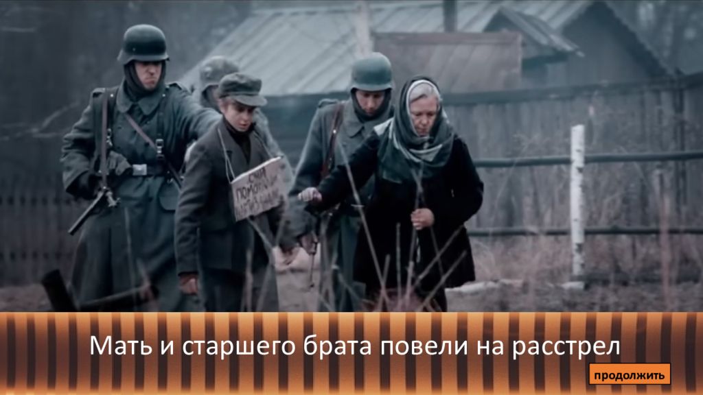 Фашисты собрали всё село и приказали выйти из строя, тех у кого родственники ушли в партизаны продолжить