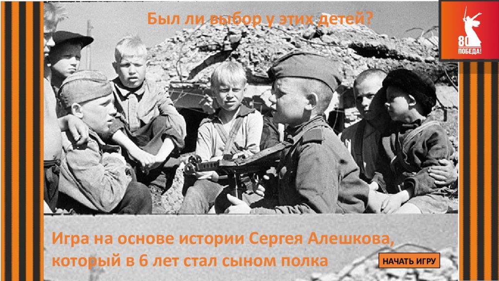 Игра на основе истории Сергея Алешкова, который в 6 лет стал сыном полка НАЧАТЬ ИГРУ Был ли выбор у этих детей?