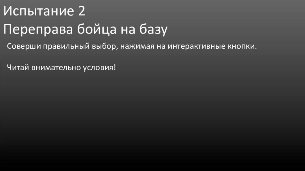 Испытание 2 Переправа бойца на базу Соверши правильный выбор, нажимая на интерактивные кнопки. Читай внимательно условия!