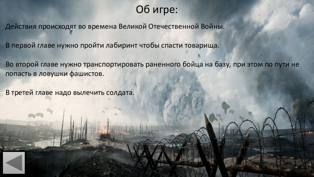 Об игре: Д ействия происходят во времена Великой Отечественной Войны. В первой главе нужно пройти лабиринт чтобы спасти товарища. Во второй главе нужно транспортировать раненного бойца на базу, при этом по пути не попасть в ловушки фашистов. В третей главе надо вылечить солдата.