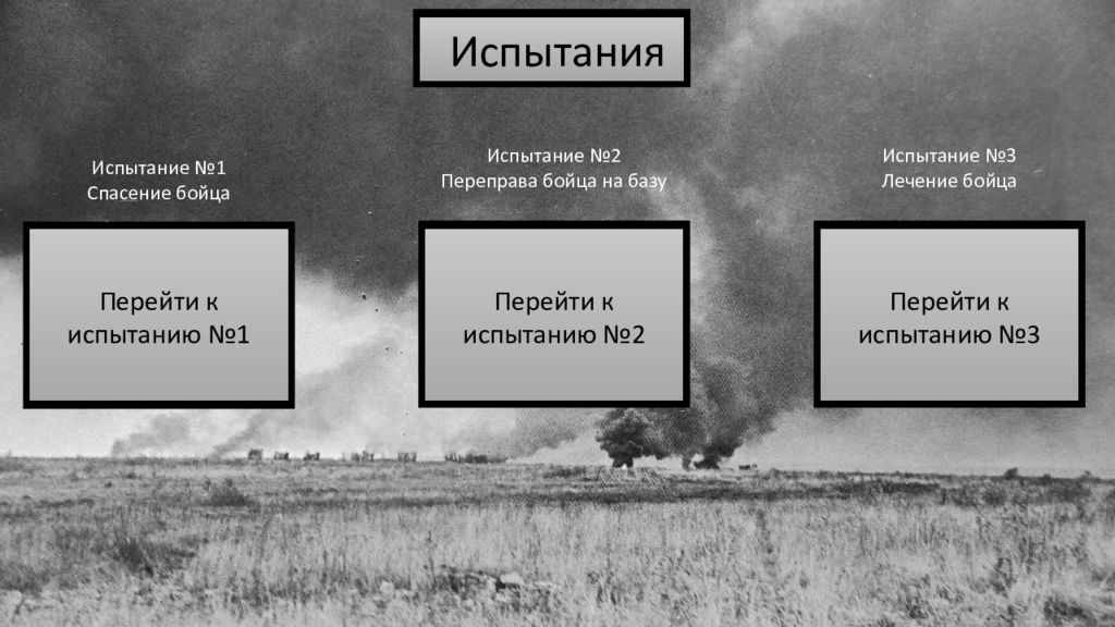 Перейти к и спытанию №1 Перейти к испытанию № 3 Перейти к испытанию № 2 Испытание №1 Спасение бойца Испытание №2 Переправа бойца на базу Испытание №3 Лечение бойца Испытания