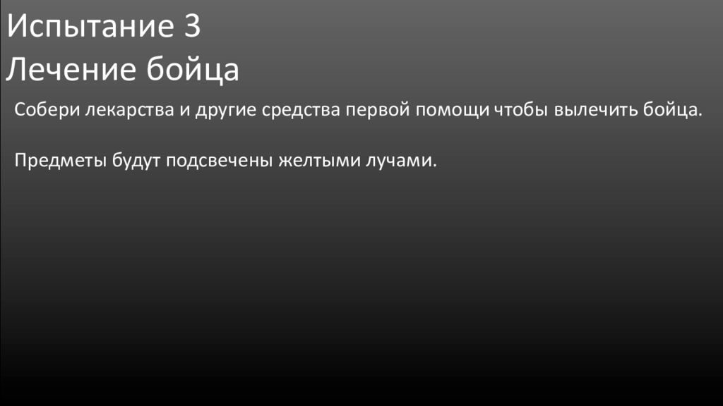 Испытание 3 Лечение бойца Собери лекарства и другие средства первой помощи чтобы вылечить бойца. Предметы будут подсвечены желтыми лучами.