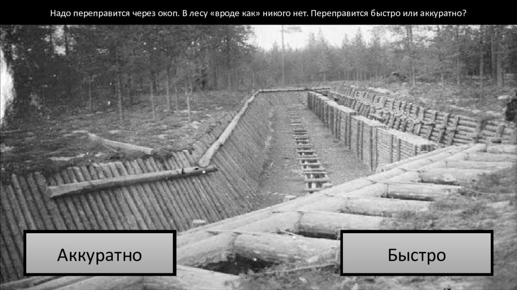 Надо переправится через окоп. В лесу «вроде как» никого нет. Переправится быстро или аккуратно? Аккуратно Быстро