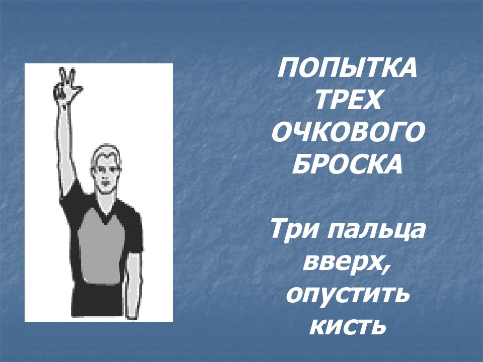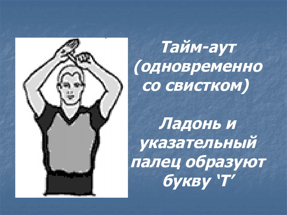 Тайм-аут (одновременно со свистком) Ладонь и указательный палец образуют букву ‘Т’