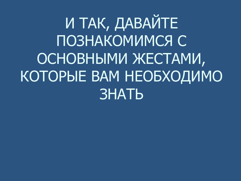 Слайд 4: И ТАК, ДАВАЙТЕ ПОЗНАКОМИМСЯ С ОСНОВНЫМИ ЖЕСТАМИ, КОТОРЫЕ ВАМ НЕОБХОДИМО ЗНАТЬ