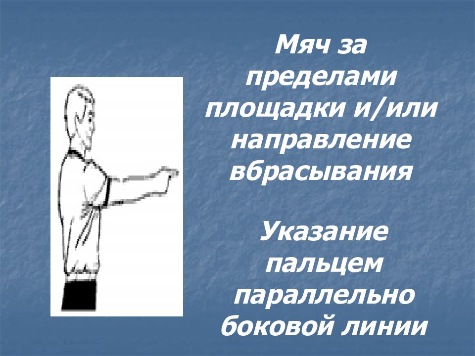 Мяч за пределами площадки и/или направление вбрасывания Указание пальцем параллельно боковой линии