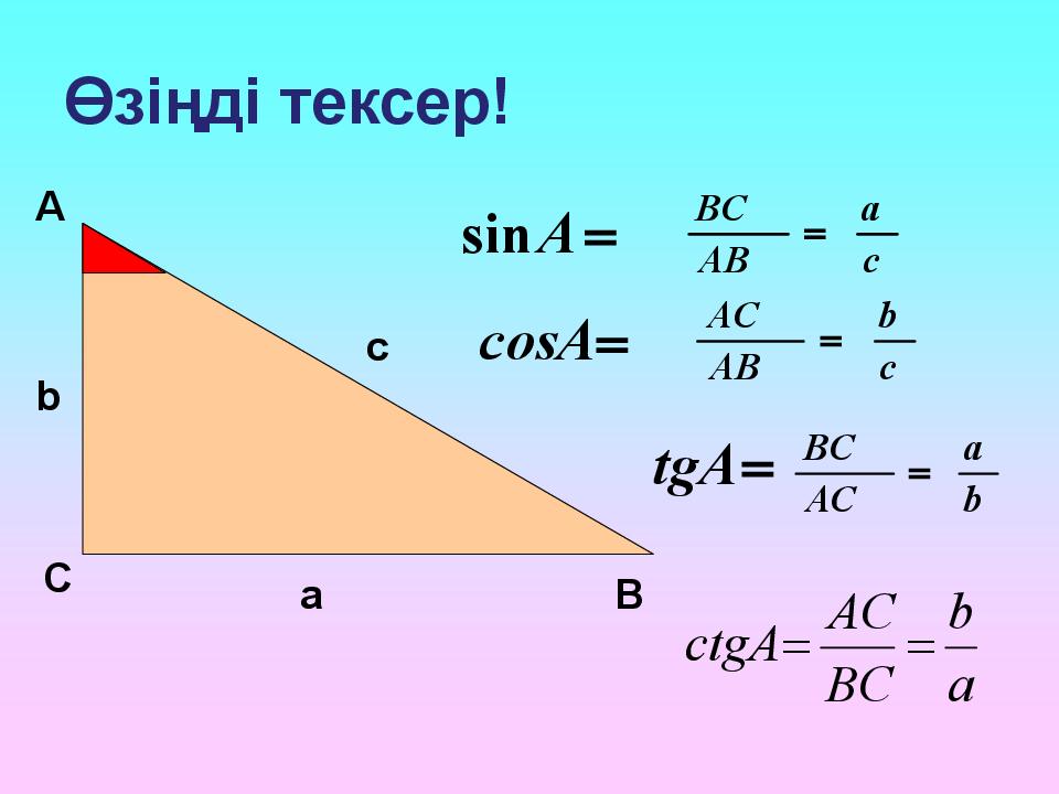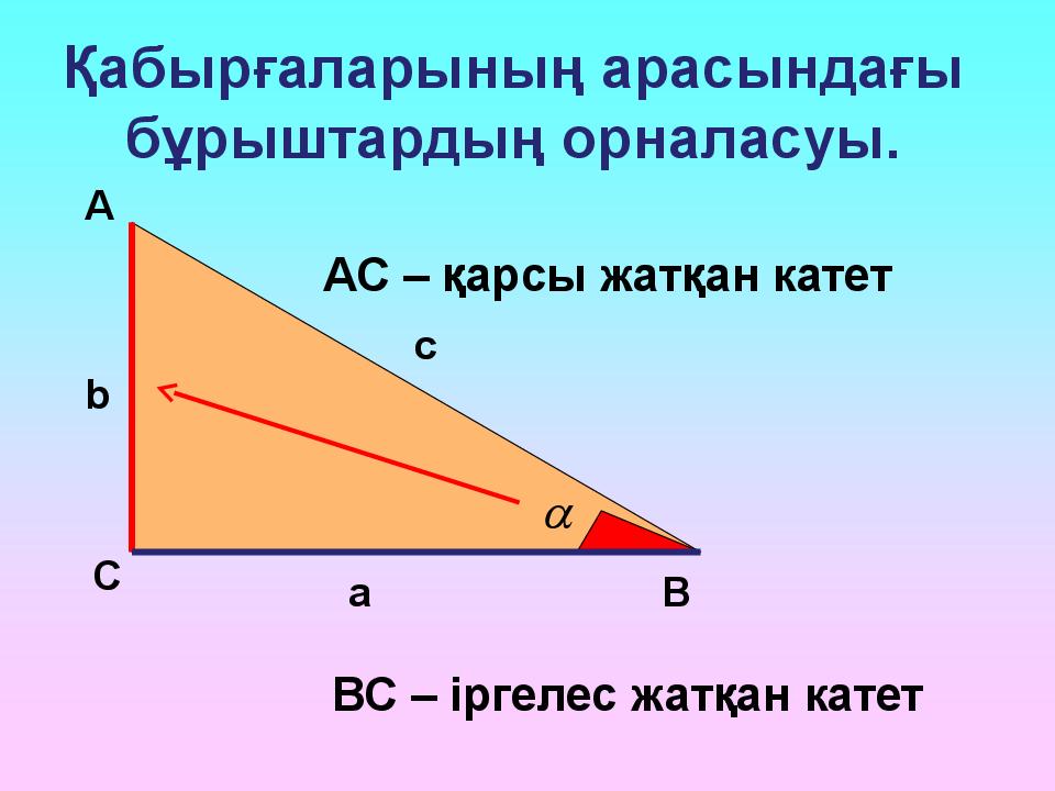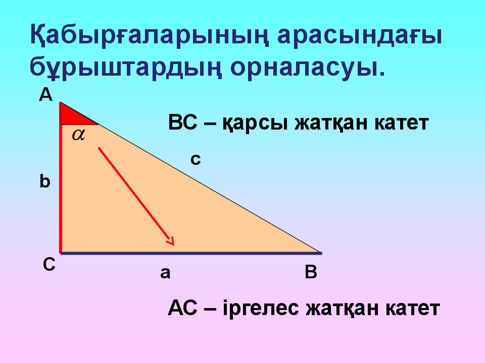 А С В b c a АС – қарсы жатқан катет ВС – іргелес жатқан катет Қабырғаларының арасындағы бұрыштардың орналасуы.