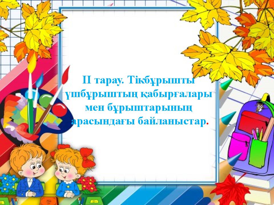 Первый слайд презентации: II тарау. Тікбұрышты үшбұрыштың қабырғалары мен бұрыштарының арасындағы байланыстар