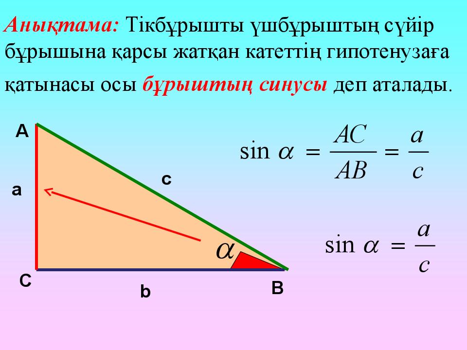 А С В b c a Анықтама: Тікбұрышты үшбұрыштың сүйір бұрышына қарсы жатқан катеттің гипотенузаға қатынасы осы бұрыштың синусы деп аталады.