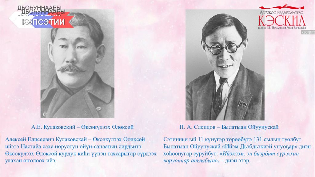 Алексей Елисеевич Кулаковскай – Өксөкүлээх Өлөксөй ийэтэ Настайа саха норуотун өйүн-санаатын сирдьитэ Өксөкүлээх Өлөксөй курдук киһи үүнэн тахсарыгар сүрдээх улахан өҥөлөөх ийэ. П. А. Слепцов – Былатыан Ойуунускай Сэтинньи ый 11 күнүгэр төрөөбүтэ 131 сылын туолбут Былатыан Ойуунускай «Ийэм Дьэбдьэкиэй уҥуоҕар» диэн хоһоонугар суруйбут: « Ийэкээм, эн биэрбит сүрэххин норуоппар аныыбын », – диэн этэр. А.Е. Кулаковский – Өксөкүлээх Өлөксөй