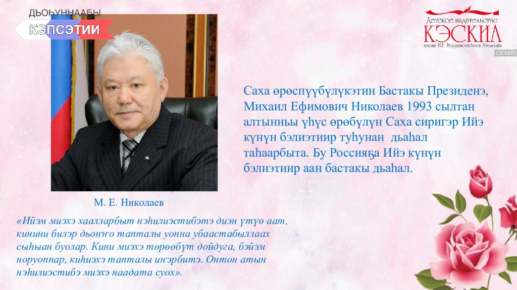 Саха өрөспүүбүлүкэтин Бастакы Президенэ, Михаил Ефимович Николаев 1993 сылтан алтынньы үһүс өрөбүлүн Саха сиригэр Ийэ күнүн бэлиэтиир туһунан дьаһал таһаарбыта. Бу Россияҕа Ийэ күнүн бэлиэтиир аан бастакы дьаһал. М. Е. Николаев «Ийэм миэхэ хаалларбыт нэһилиэстибэтэ диэн үтүө аат, кинини билэр дьоҥҥо тапталы уонна убаастабыллаах сыһыан буолар. Кини миэхэ төрөөбүт дойдуга, бэйэм норуоппар, киһиэхэ тапталы иҥэрбитэ. Онтон атын нэһилиэстибэ миэхэ наадата суох».