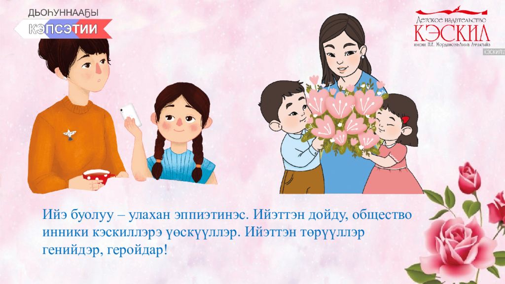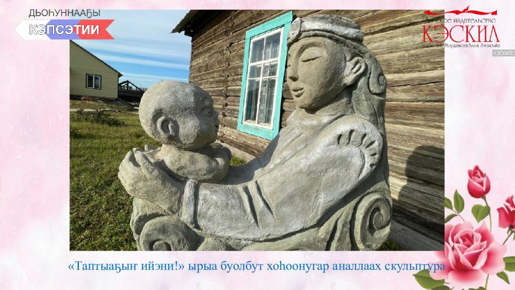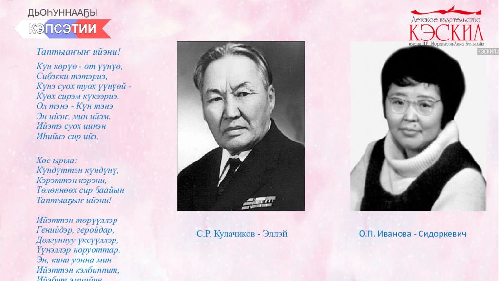 Таптыаҥыҥ ийэни! Күн көрүө - от үүнүө, Сибэкки тэтэриэ, Күнэ суох туох үүнүөй - Күөх сирэм күкээриэ. Ол тэнэ - Күн тэнэ Эн ийэҥ, мин ийэм. Ийэтэ суох иинэн Иһийиэ сир ийэ. Хос ырыа: Күндүттэн күндүнү, Кэрэттэн кэрэни, Төлөннөөх сир баайын Таптыаҕыҥ ийэни! Ийэттэн төрүүллэр Генийдэр, геройдар, Долгуннуу үксүүллэр, Үүнэллэр норуоттар. Эн, кини уонна мин Ийэттэн кэлбиппит, Ийэбит эмиийин Илгэтин испиппит. С.Р. Кулачиков - Эллэй . О.П. Иванова - Сидоркевич
