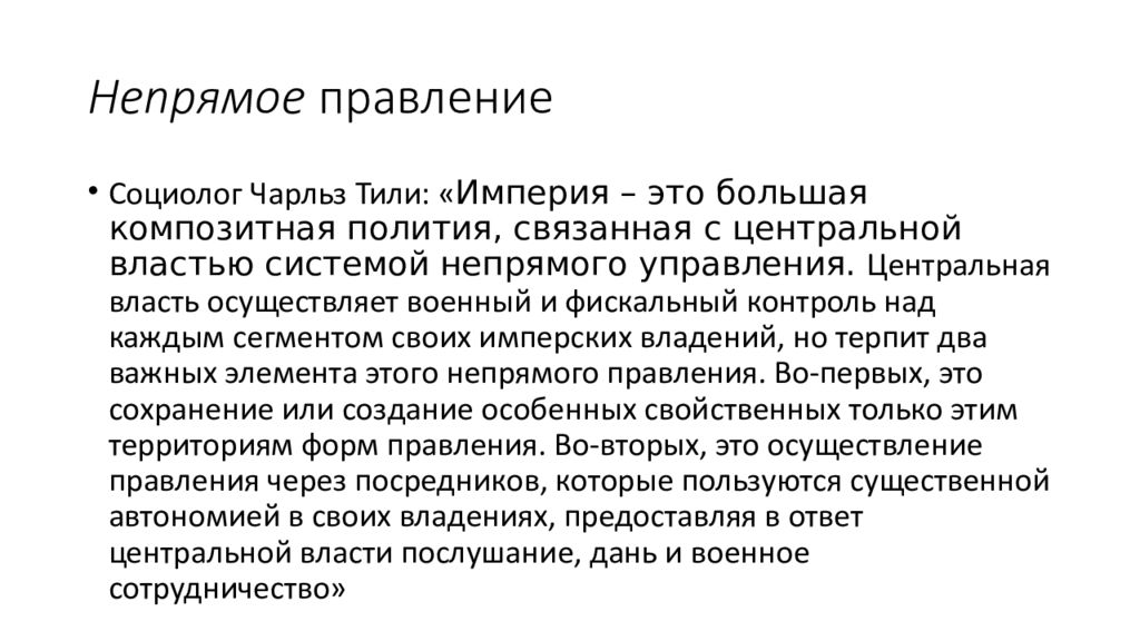Социолог Чарльз Тили: « Империя – это большая композитная полития, связанная с центральной властью системой непрямого управления. Центральная власть осуществляет военный и фискальный контроль над каждым сегментом своих имперских владений, но терпит два важных элемента этого непрямого правления. Во-первых, это сохранение или создание особенных свойственных только этим территориям форм правления. Во-вторых, это осуществление правления через посредников, которые пользуются существенной автономией в своих владениях, предоставляя в ответ центральной власти послушание, дань и военное сотрудничество»