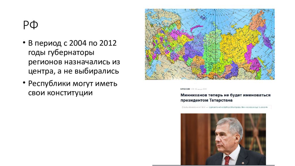 В период с 2004 по 2012 годы губернаторы регионов назначались из центра, а не выбирались Республики могут иметь свои конституции