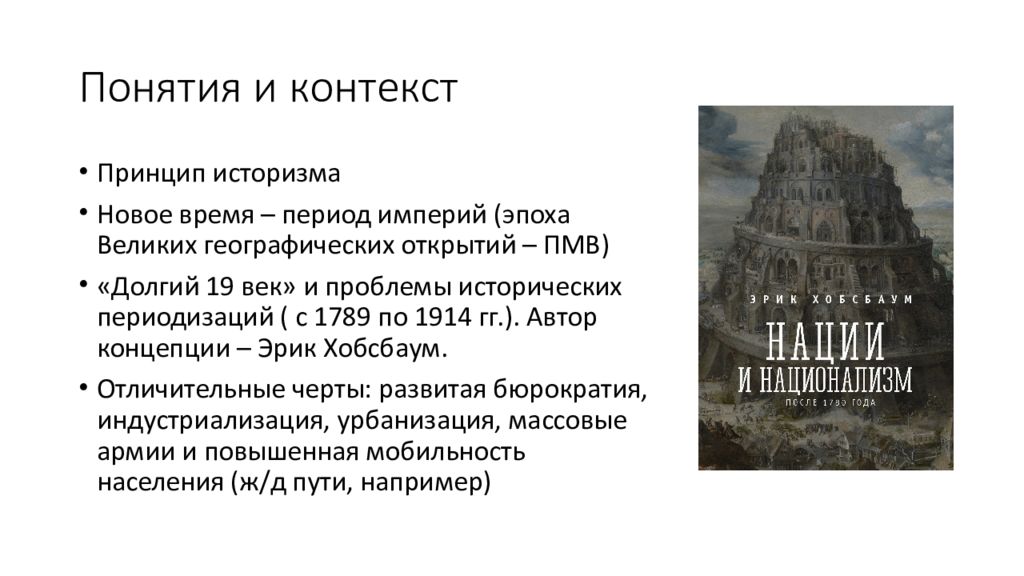 Принцип историзма Новое время – период империй (эпоха Великих географических открытий – ПМВ) «Долгий 19 век» и проблемы исторических периодизаций ( с 1789 по 1914 гг.). Автор концепции – Эрик Хобсбаум. Отличительные черты: развитая бюрократия, индустриализация, урбанизация, массовые армии и повышенная мобильность населения (ж / д пути, например)