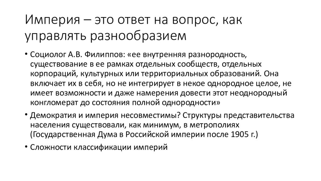 Социолог А.В. Филиппов: «ее внутренняя разнородность, существование в ее рамках отдельных сообществ, отдельных корпораций, культурных или территориальных образований. Она включает их в себя, но не интегрирует в некое однородное целое, не имеет возможности и даже намерения довести этот неоднородный конгломерат до состояния полной однородности» Демократия и империя несовместимы? Структуры представительства населения существовали, как минимум, в метрополиях (Государственная Дума в Российской империи после 1905 г.) Сложности классификации империй