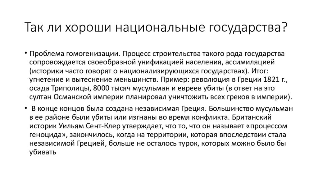 Проблема гомогенизации. Процесс строительства такого рода государства сопровождается своеобразной унификацией населения, ассимиляцией (историки часто говорят о национализирующихся государствах). Итог: угнетение и вытеснение меньшинств. Пример: революция в Греции 1821 г., осада Триполицы, 8000 тысяч мусульман и евреев убиты (в ответ на это султан Османской империи планировал уничтожить всех греков в империи). В конце концов была создана независимая Греция. Большинство мусульман в ее районе были убиты или изгнаны во время конфликта. Британский историк Уильям Сент-Клер утверждает, что то, что он называет «процессом геноцида», закончилось, когда на территории, которая впоследствии стала независимой Грецией, больше не осталось турок, которых можно было бы убивать
