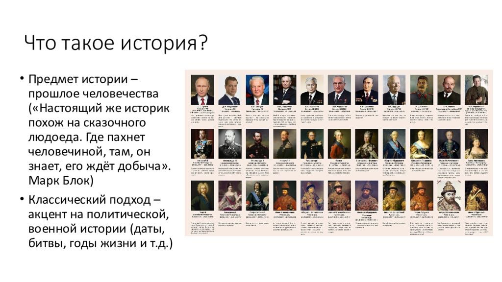 Предмет истории – прошлое человечества («Настоящий же историк похож на сказочного людоеда. Где пахнет человечиной, там, он знает, его ждёт добыча». Марк Блок) Классический подход – акцент на политической, военной истории (даты, битвы, годы жизни и т.д.)