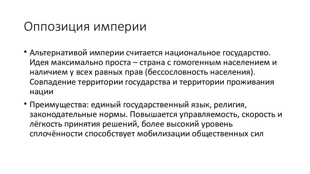 Альтернативой империи считается национальное государство. Идея максимально проста – страна с гомогенным населением и наличием у всех равных прав (бессословность населения). Совпадение территории государства и территории проживания нации Преимущества: единый государственный язык, религия, законодательные нормы. Повышается управляемость, скорость и лёгкость принятия решений, более высокий уровень сплочённости способствует мобилизации общественных сил