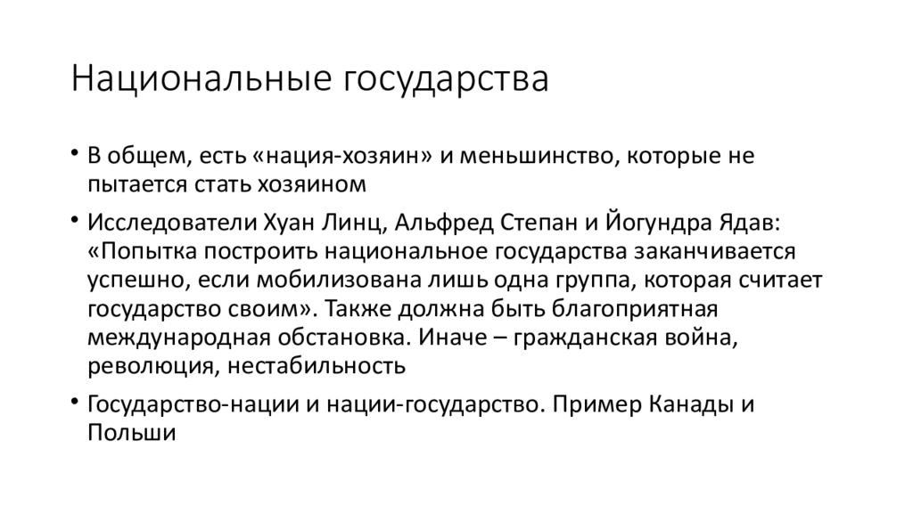 В общем, есть «нация-хозяин» и меньшинство, которые не пытается стать хозяином Исследователи Хуан Линц, Альфред Степан и Йогундра Ядав : «Попытка построить национальное государства заканчивается успешно, если мобилизована лишь одна группа, которая считает государство своим». Также должна быть благоприятная международная обстановка. Иначе – гражданская война, революция, нестабильность Государство-нации и нации-государство. Пример Канады и Польши