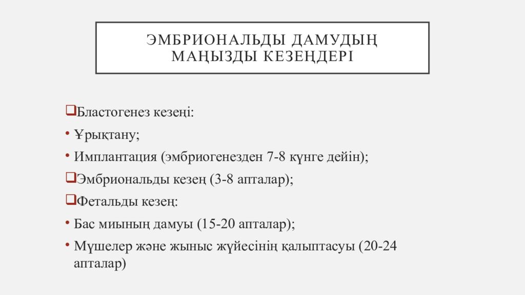Бластогенез кезеңі: Ұрықтану ; Имплантация ( эмбриогенезден 7-8 күнге дейін ); Эмбриональды кезе ң (3-8 апталар); Фетальды кезең: Бас миының дамуы (15-20 апталар); Мүшелер және жыныс жүйесінің қалыптасуы ( 20-24 апталар )
