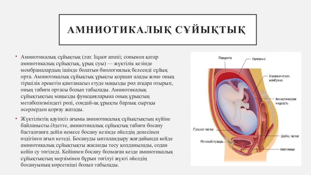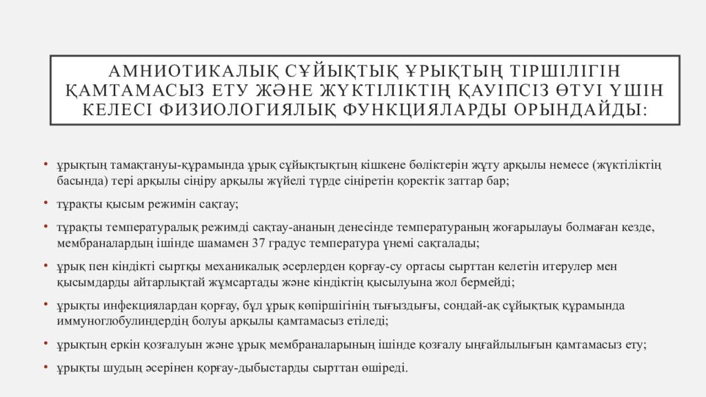 Слайд 17: Амниотикалық сұйықтық ұрықтың тіршілігін қамтамасыз ету және жүктіліктің қауіпсіз өтуі үшін келесі физиологиялық функцияларды орындайды :