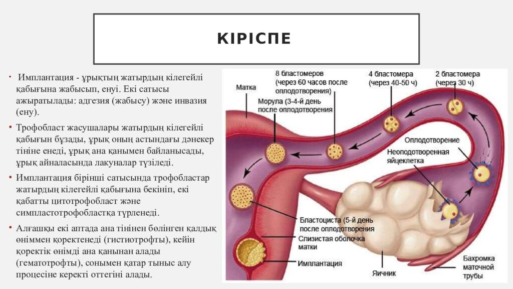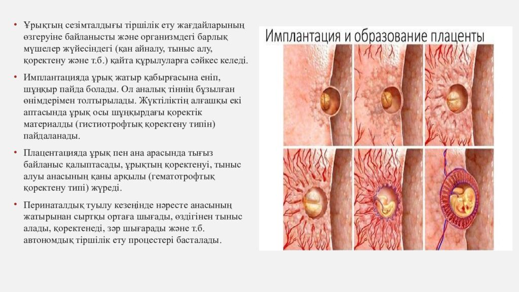 Имплантация - ұрықтың жатырдың кілегейлі қабығына жабысып, енуі. Екі сатысы ажыратылады : адгезия ( жабысу ) және инвазия ( ену ). Трофобласт жасушалары жатырдың кілегейлі қабығын бұзады, ұрық оның астындағы дәнекер тініне енеді, ұрық ана қанымен байланысады, ұрық айналасында лакуналар түзіледі. Имплантация бірінші сатысында трофобластар жатырдың кілегейлі қабығына бекініп, екі қабатты цитотрофобласт және симпластотрофобластқа түрленеді. Алғашқы екі аптада ана тінінен бөлінген қалдық өніммен қоректенеді ( гистиотрофты ), кейін қоректік өнімді ана қанынан алады ( гематотрофты ), сонымен қатар тыныс алу процесіне керекті оттегіні алады.