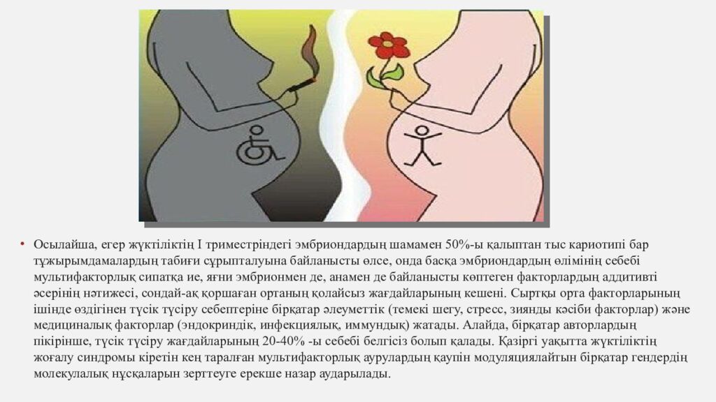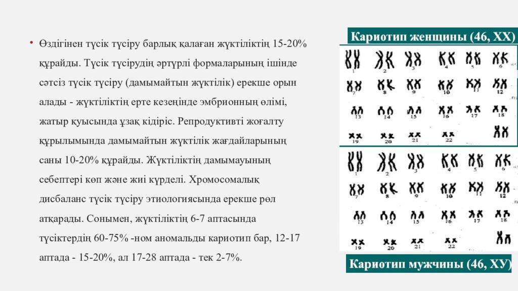 Жүктіліктің жоғалу қаупімен байланысты гендердің шамамен 7 түрлі тобы сипатталған. Оларға келесі гендік желілер жатады : детоксикацияның II фазалық гендері ( GSTM1, GSTT1, GSTP1); плазмалық гемостаз гендері ( FGB, PTM, FVL, XII); иммундық жүйенің гендері ( DQA1, DQB2, DQB1, HLA-G, ILIB); гормондардың метаболизм гендері ( PGR, ER); факторлар гендері хорион мен плацентаның өсуі ( VEGF, IGF1, TNFA, TGFB); фолий қышқылы мен В12 витаминінің метаболизм гендері ( MTHFR, MTRR, MTR). Аталған гендердің полиморфизмінің ана -плацента- ұрық жүйесіне әсері ана жағынан да, ұрық жағынан да жүзеге асырылады. Ерте эмбриональды өлімнің этиологиясында эмбрионның бұзылуына ерекше рөл беріледі : эпигенетикалық реттеу, анықталмаған, хромосомалық аномалиялардың сирек мозаикалық нұсқалары, біртектес дисомия, қайталанатын тізбектердің мутация жиілігінің жоғарылауы.Бұл зерттеудің мақсаты-жүктілік пен анембрион дамымаған әйелдердегі түсік тастаған эмбриондар арасындағы хромосомалық патологияның жиілігі мен құрылымын зерттеу.
