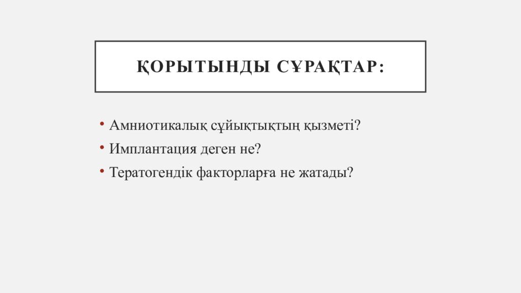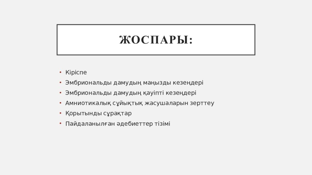 Кіріспе Эмбриональды дамудың маңызды кезеңдері Эмбриональды дамудың қауіпті кезеңдері Амниотикалық сұйықтық жасушаларын зерттеу Қорытынды сұрақтар Пайдаланылған әдебиеттер тізімі