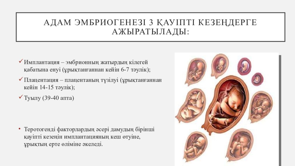 Имплантация – эмбрионның жатырдың кілегей қабатына енуі ( ұрықтанғаннан кейін 6-7 тәулік ); Плацентация – плацентаның түзілуі ( ұрықтанғаннан кейін 14-15 тәулік ); Туылу (39-40 апта ) Теротогенді факторлардың әсері дамудың бірінші қауіпті кезеңін имплантацияның кеш өтуіне, ұрықтың ерте өліміне әкеледі.