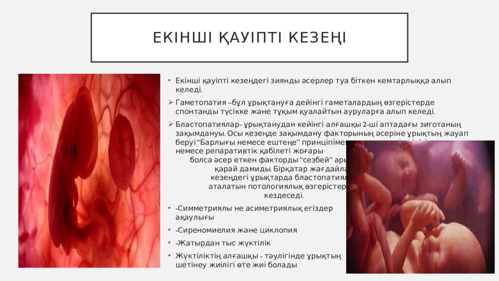 Екінші қауіпті кезеңдегі зиянды әсерлер туа біткен кемтарлыққа алып келеді. Гаметопатия – бұл ұрықтануға дейінгі гаметалардың өзгерістерде спонтанды түсікке және тұқым қуалайтын ауруларға алып келеді. Бластопатиялар - ұрықтанудан кейінгі алғашқы 2-ші аптадағы зиготаның зақымдануы. Осы кезеңде зақымдану факторының әсеріне ұрықтың жауап беруі “ Барлығы немесе ештеңе ” принціпімен, яғни ұрық тіршілігін жояды немесе репаративтік қабілеті жоғары болса әсер еткен факторды “ сезбей ” ары қарай дамиды. Бірқатар жағдайларда осы кезеңдегі ұрықтарда бластопатиялар деп аталатын потологиялық өзгерістер кездеседі. - Симметриялы не асиметриялық егіздер ақаулығы - Сиреномиелия және циклопия - Жатырдан тыс жүктілік Жүктіліктің алғашқы - тәулігінде ұрықтың шетінеу жиілігі өте жиі болады