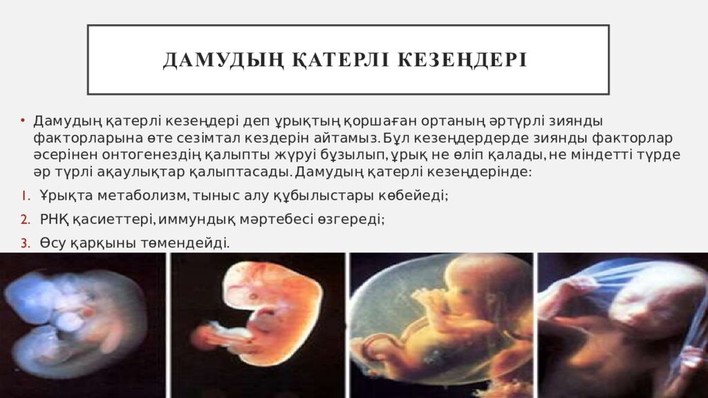 Дамудың қатерлі кезеңдері деп ұрықтың қоршаған ортаның әртүрлі зиянды факторларына өте сезімтал кездерін айтамыз. Бұл кезеңдердерде зиянды факторлар әсерінен онтогенездің қалыпты жүруі бұзылып, ұрық не өліп қалады, не міндетті түрде әр түрлі ақаулықтар қалыптасады. Дамудың қатерлі кезеңдерінде : Ұрықта метаболизм, тыныс алу құбылыстары көбейеді ; РНҚ қасиеттері, иммундық мәртебесі өзгереді ; Өсу қарқыны төмендейді.